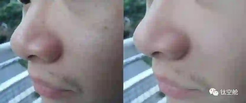 吸黑头仪平行于黑头进行作用,利用变频脉冲吸力,能够有效地将黑头连根拔起,不会将黑头根部残留在皮肤深层,同时也不会对周围的肌肤造成撕扯等伤害。使用前后对比图▼