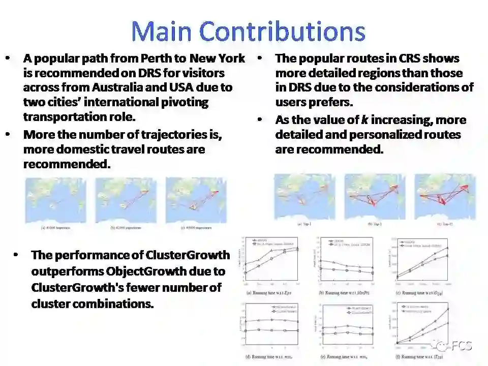 本文首先基于Instagram的地理标记照片,建立了一个统计可靠的轨迹数据库,并使用DBSCAN方法对这些轨迹进行聚类,以发现旅客密度。然后,将每个原始时空轨迹转换成一系列的集群。通过Cluster-Growth算法,再进一步将所有有差异的封闭兴趣圈识别出来。最后,在封闭兴趣圈上应用了距离感知和从众性感知的推荐策略,推荐出受欢迎的旅行线路。文章最后使用可视化演示结果和大量的实验结果展现了本文方法的高效性。