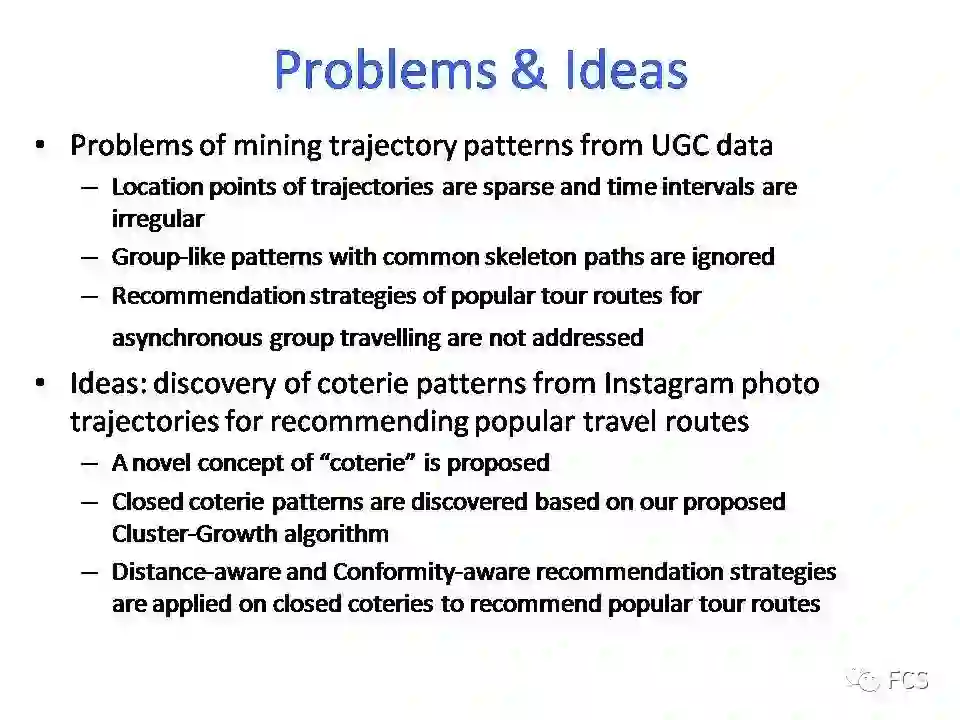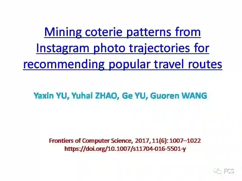 然而,目前鲜有研究工作可从不同游客的Instagram图片中提取出兴趣类似的一小组人的旅行轨迹。为此,本文提出了一个创新的概念:兴趣圈(coterie),揭示在相同位置和路径,游客拍摄的Instagram图片中隐藏的具有代表性的旅行轨迹模式。文章描述了三方面工作发现,包括兴趣圈(coterie)、封闭兴趣圈,和基于封闭兴趣圈的出游路线推荐系统。