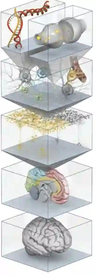脑是我们已知宇宙中最为复杂的系统,它有着极多的层次(图 2 中其实只画出了最粗划分的层次),在每个层次上都会产生下一层次所没有的 “涌现性质 ”(emergent property)。