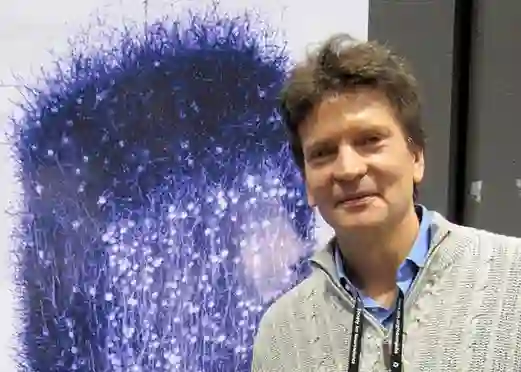 图 1. HBP 的发起人马克拉姆和他心爱的鼠皮层柱微回路仿真结果。(引自 http://img.clubic.com/02BB000007384273-photo-henry-markram.jpg)