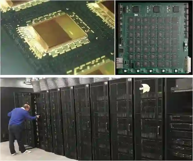 图 4. SpiNNaker 系统。(左上图)SpiNNaker 芯片;(右上图)由 48 个芯片构成的电路板:(下图)由电路板构成的 SpiNNaker 系统。(University of Manchester, by Steve Furber and colleagues)