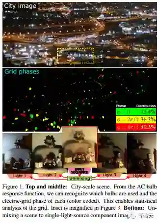 交流电(AC)照明带来了夜的节拍。 通过对这种节拍的感受,我们揭示了新的场景信息,包括:场景中的灯泡类型,城市规模的电网分段(phase)以及光传输矩阵。这种信息区分了反射和半反射,夜间高动态范围以及在采集期间未观察到的灯泡的场景渲染(scene rendering)。 后者由我们收集并提供的来源丰富的灯泡响应函数数据库促成。为了实现以上工作,我们构建了一种新颖的 coded- exposure 高动态范围成像技术,专门设计用于在电网交流照明上运行。