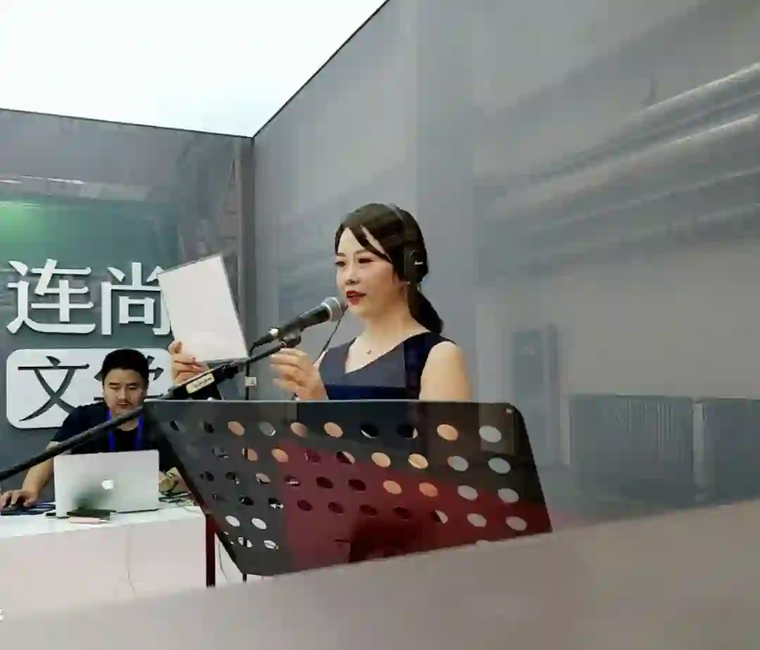 网络文学大会,一位美女声优老师在连尚文学展台的“网文练习声”录音棚录制有声书。