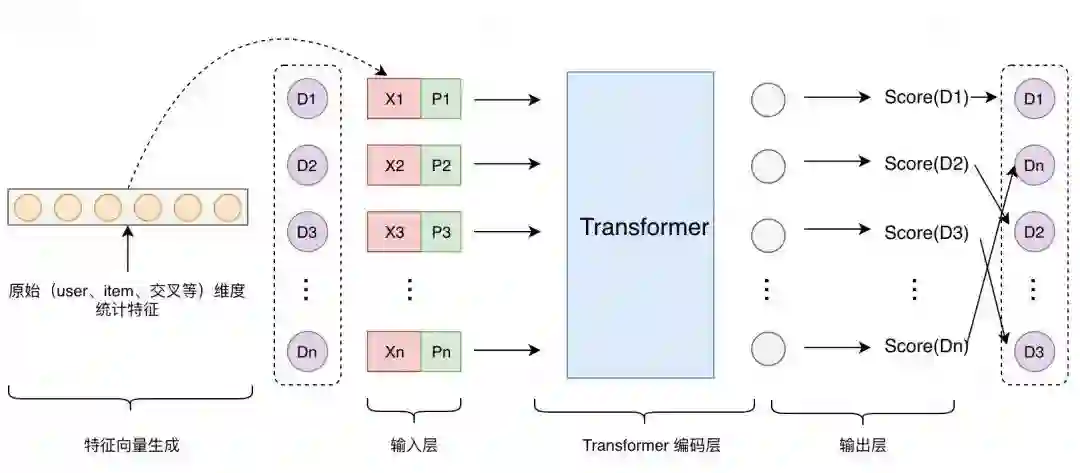 模型结构参考了 PRM[5],结合美团搜索实践的情况,重排序模型相比 PRM 做了一些调整。具体结构如图 6 所示,其中 D1,D2,…,Dn 是重排商户集合,最后根据模型的输出 Score(D1),Score(D2),…,Score(Dn)按照从大到小进行排序。