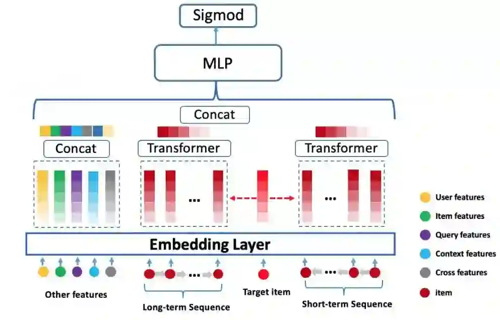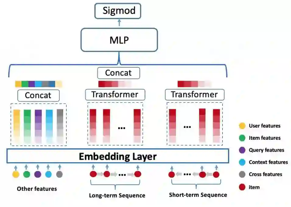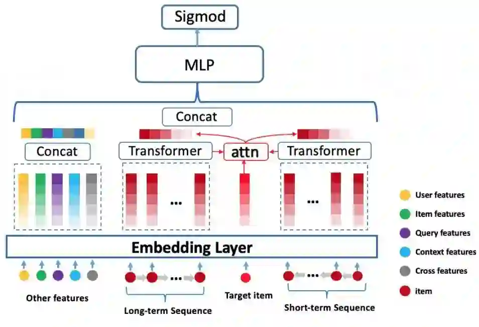 模型主要构成:所有特征(user 维度、item 维度、query 维度、上下文维度、交叉维度)经过底层 Embedding Layer 得到对应的 Embedding 表示;建模用户行为序列得到用户的 Embedding 表示;所有 Embedding concat 一起送入到三层的 MLP 网络。