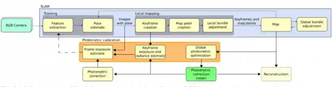 第三篇文章基于相机在移动,照明是静态的,反射属于朗伯反射的假设条件下,提出了一种在不需要均匀照明表面、已知纹理以及特定几何形状等信息的前提下,实现实时在线的光晕和响应校准。