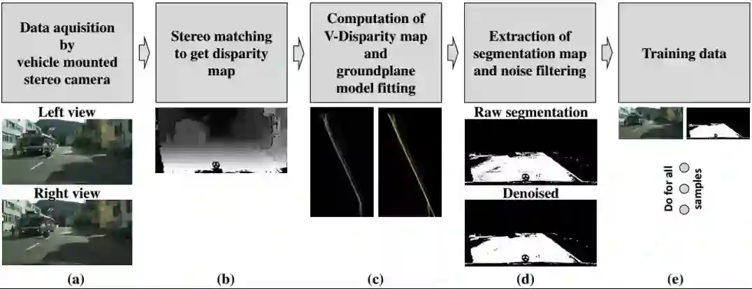 第三篇文章提出了一种基于深度神经网络(DNN),针对可驾驶区域分割任务的训练数据生成方法。作者提出了一种自动的标注流程,利用确定性立体的地面检测方法,创建了适合神经网络训练的大型数据集,为道路分割任务作出了贡献。