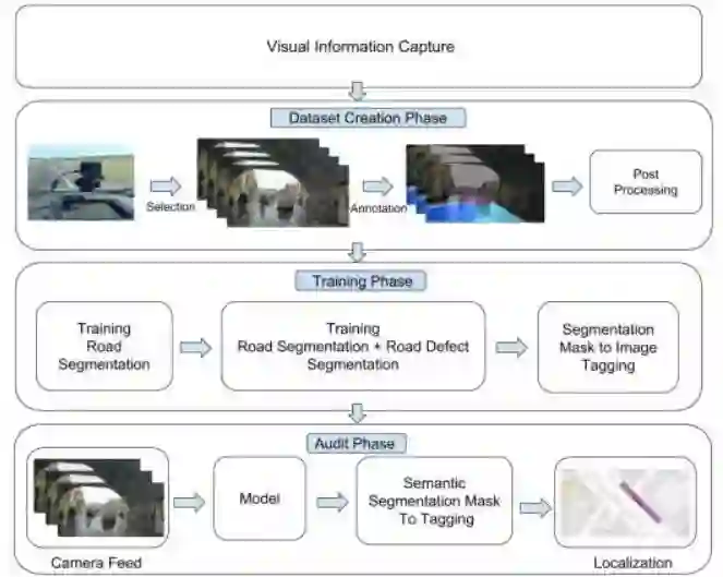 第一篇文章利用深度学习和语义分割的一些最新进展,提出了一个城市规模的自动道路审计系统,用于收集城市道路网络的缺陷信息。同时,作者还提出了一种多步深度学习模型,该模型对道路进行分割并将道路的缺陷进一步细分,为每个缺陷标记框架,最后将缺陷定位在使用GPS收集的地图上。