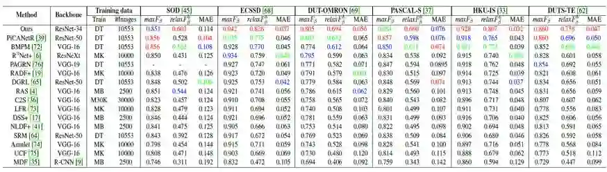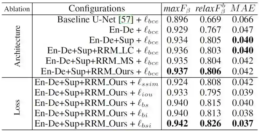 是边界评价标准,可以参考文献 [3]。下面是各种 loss 的情况下,显著性检测的效果,在传统困难的多物体重合与背景差别不大的情况下,从效果图中能看到三种 loss 一起的效果跟有结构性损失的效果都表现的不错。