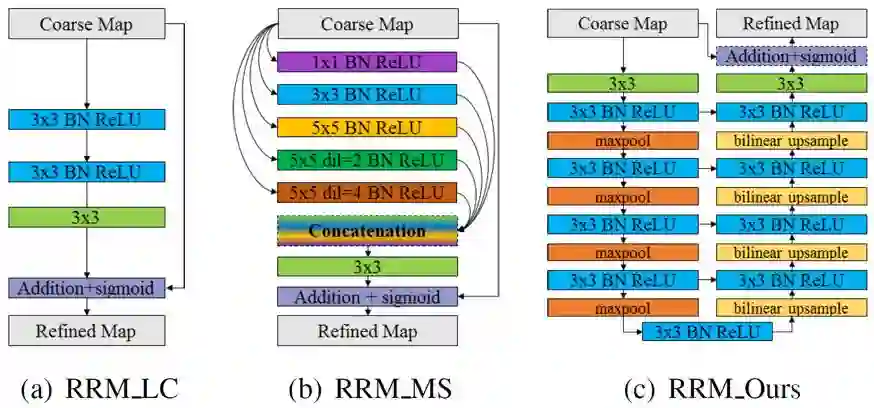 ▲ Figure 4. (a) local boundary refinement module RRM_LC; (b) multi-scale refinement module RRM_MS; (c) our encoder-decoder refinement module RRM_Ours