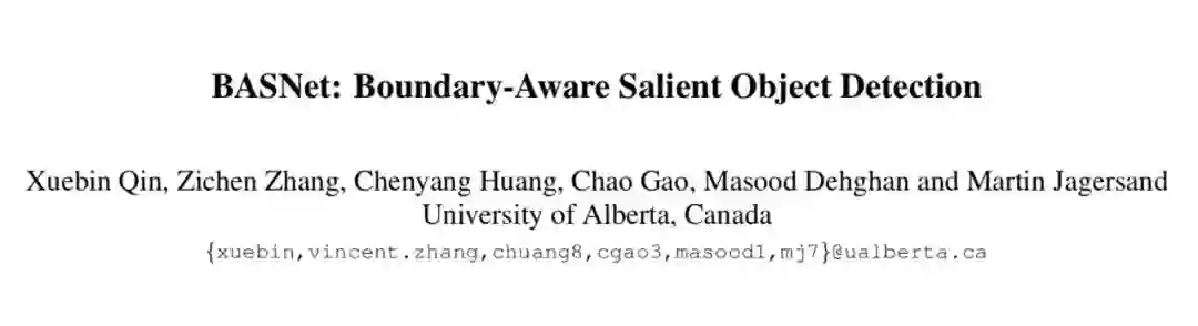 [1]. Xuebin Qin, Zichen Zhang, Chenyang Huang, Chao Gao, Masood Dehghan, Martin Jagersand. BASNet: Boundary-Aware Salient Object Detection. The IEEE Conference on Computer Vision and Pattern Recognition (CVPR), 2019, pp. 7479-7489.