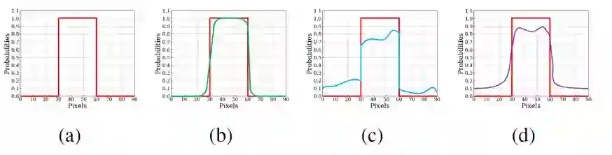 ▲ Figure 2. (a)红色:GT(Ground Truth,以下都简称GT)的概率图,(b)绿色:粗糙边界与GT不对齐,(c)蓝色:粗糙区域内部判定概率也低,(d)紫色:粗糙的预测通常都有这两个问题。