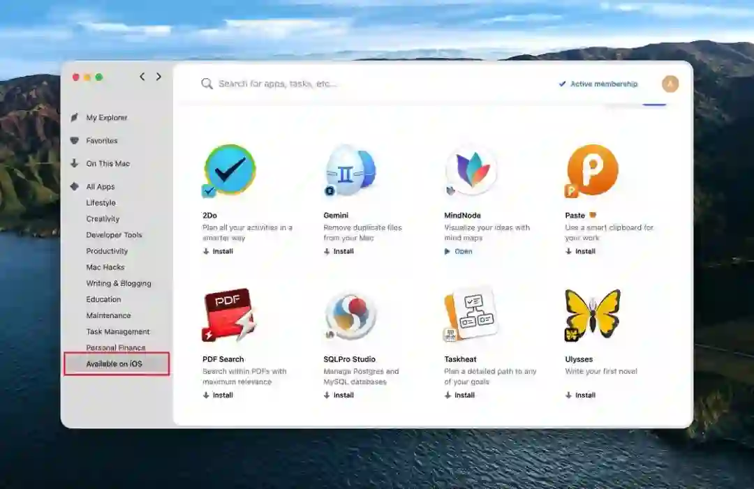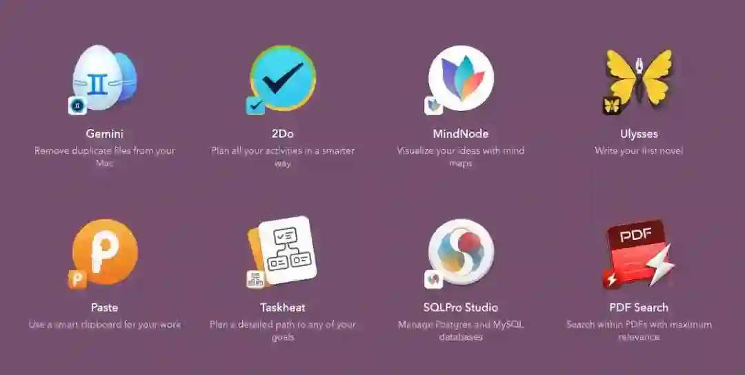 在 Setapp 中支持 iOS 端订阅的也做了明显的标示,除了侧边栏的「Available on iOS」之外,应用图标左下角还会带有小 logo 标记,即 iOS 端的 App 图标。