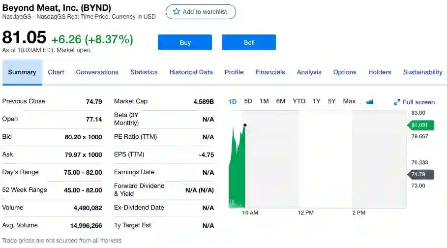 美股人造肉第一股Beyond Meat上市以来涨超220%