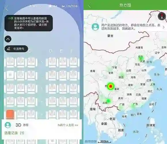 航旅纵横在其新版App中,新加入了名为“虚拟客舱功能”的新内容。用户在该App中进行选座后,还可以在选座页面上,点击其他已选的座位,下方相应会出现“Ta的个人主页”,点击进去可查看该用户的飞行热力图。