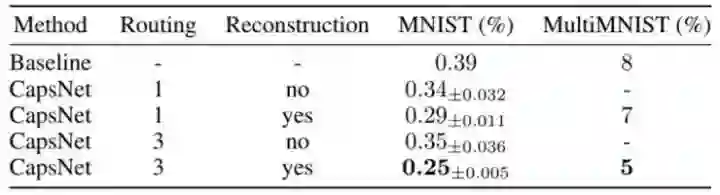 测试中作者使用的是单一模型,没有进行“综合”或者明显的数据扩增方法。作者们通过3层神经网络实现了较低的错误率(0.25%),这一错误率以往只有更深的网络才能达到。表中展现的是不同设置的CasNet在NMIST数据库上的测试错误率,表明了路由以及正则器重构的重要性。其基线是一个标准的三层神经网络(CNN)。