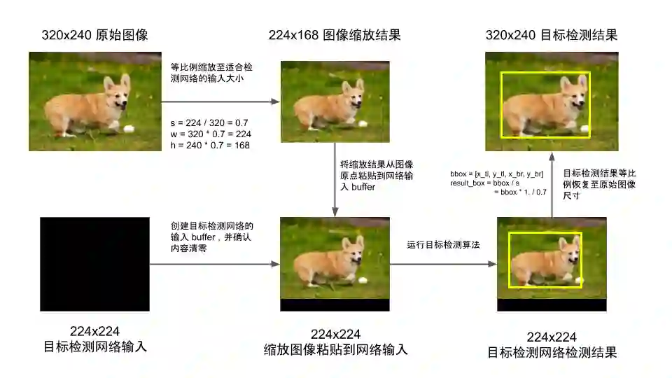 另外,我们还可以考虑在模型转换时配置适合的输入大小,然后在预处理做一些 Crop-Padding-Resize 的操作,最后对模型的输出结果按照 Reisze 的比例进行解析得到我们期望的结果。具体的操作流程与原理如下图所示: