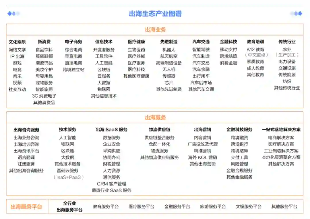 出海服务:指企业为从事出海业务(包括自营类及平台类)的公司提供服务,围绕出海业务各领域中遇到的痛点提供相应的解决方案,如代理经销、落地招商、资源整合、融入市场、财税法规等服务。