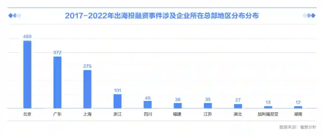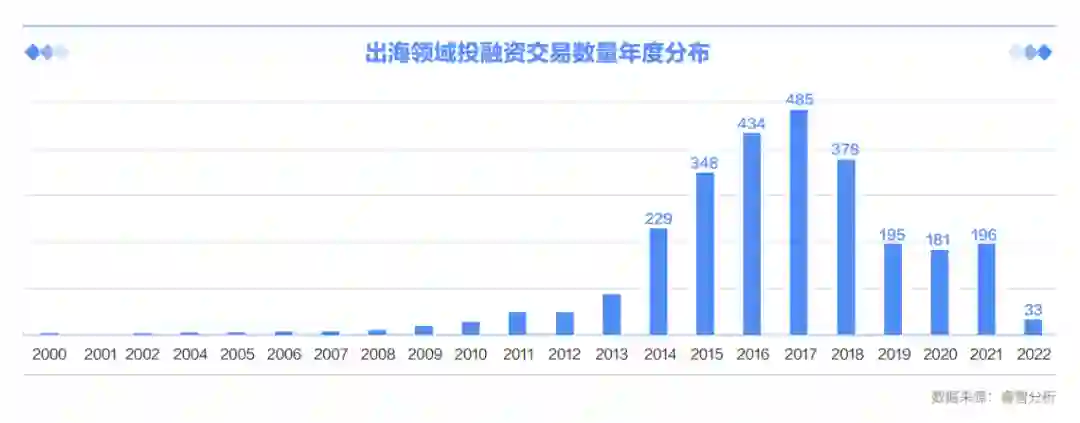 从资本布局来看,创业邦睿兽分析统计显示,近年来出海领域中国企业在2015-2018年间集中获投,资本持续押注,一改2013年之前资本在此领域尚未规模化的态势。2017年,出海领域有485件融资交易发生,达到近年来峰值。此后,在2019年呈现回落态势,但在2020年疫情爆发后,资本入局状态并未收缩,2021年出海领域发生196件融资交易,同比上年有小幅提升。获投数量规模趋稳定,对外辐射效应逐年扩大。