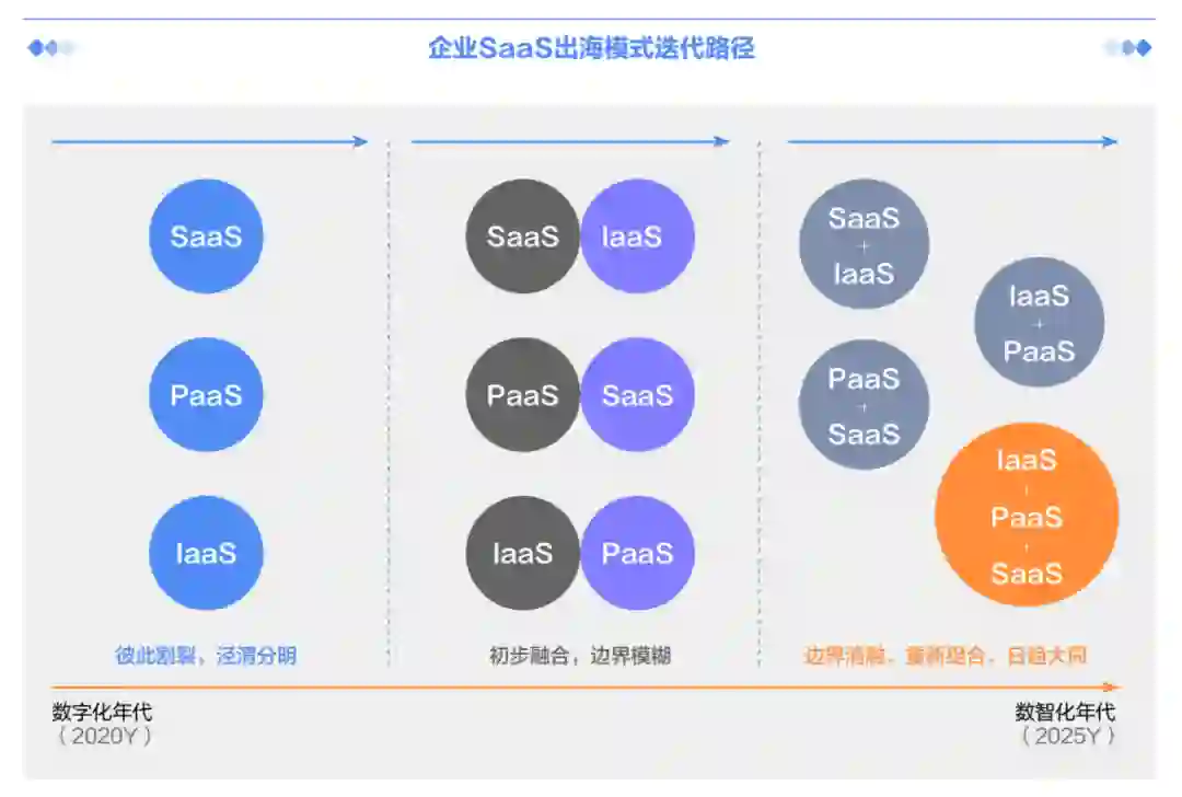 在出海服务板块,B端服务成为全球热点。例如,中国SaaS服务出海厂商呈现了两种不同的发展路径。一部分厂商跟随国内客户出海而一起出海,针对出海企业所需来完善出海服务;另一部分则直接瞄准海外市场,服务于全球企业和目标市场当地企业。而国内企业SaaS市场出海经历了SaaS、Paas及Iaas从割裂发展到初步融合,再到深度融合的发展过程,在国内形成了当下“大而全”的发展模式。