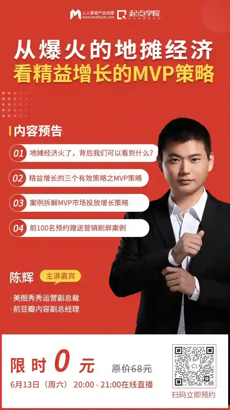 做过千万级日活产品的用户运营,实现过每日数百万的运营收入,组织过百万级的用户活动的@陈辉老师,用1小时的时间为大家拆解营销增长的MVP策略。