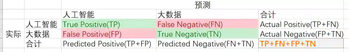 先看人工智能专业,实际有100个同学,然后分类器分类之后得到的结果是80名同学都归到了左边,表示分类正确,有20名同学分到右边,表示分类错误。同理大数据专业,有10名同学分类到左边,表示分类错误,有90名同学归到右边,表示分类正确。