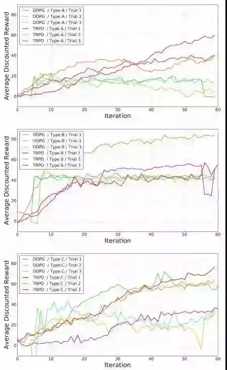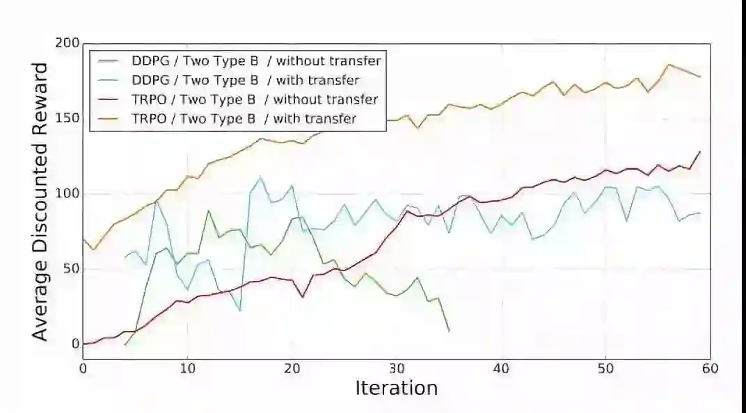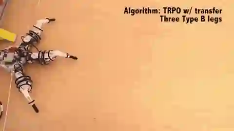 实验人员应用了两种先进的深度学习算法——Trust Region Policy Optimization(TRPO)和Deep Deterministic Policy Gradient(DDPG),这两种算法可以训练神经网络做简单的前进和爬行动作。利用搭建好的环境,上述两种算法都能在高度随机的硬件和环境条件下有效学习简单的运动策略。实验人员将这种学习迁移到了模块化有腿机器人上。