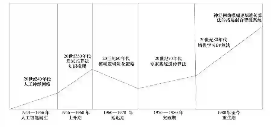 人工智能在近几十年的大致发展趋势如图 1 所示。由图 1可以看出:1943年人工智能开始萌芽,人工智能主要以人工神经网络的形式存在;1956年正式诞生,并逐步进入了上升期,启发式算法知识推理等开始盛行;而进入20世纪60年代以后,开始了模糊逻辑进化策略,这一时期也是人工智能技术发展的延迟期;20世纪70年代以后,专家系统遗传算法等开始出现,人工智能技术在这一时期取得了很大的突破;20世纪80年代至今,又步入了一个新的发展阶段,越来越多的技术以及算法不断成熟,并且在很多领域得到了应用。