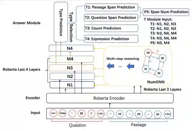 从流程上来说,首先使用预训练语言模型编码文本和问题信息,通过编码方式获取语义结构化的先验知识。随后,将编码的信息输入推理层中,这是 NumNet+的核心层,用于进行数字感知。模型可以学习到用哪些数字进行比较,以及比较这些数字的方法。