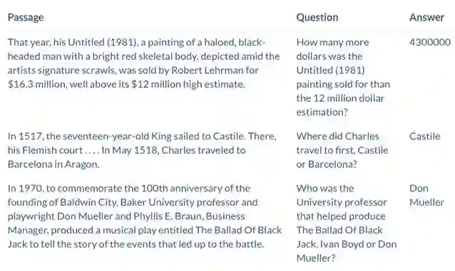 DROP 数据集中的一些文本、问题和对应的答案。可以看出,模型需要进行对数值进行加减、按年代排序、或进行因果推理。