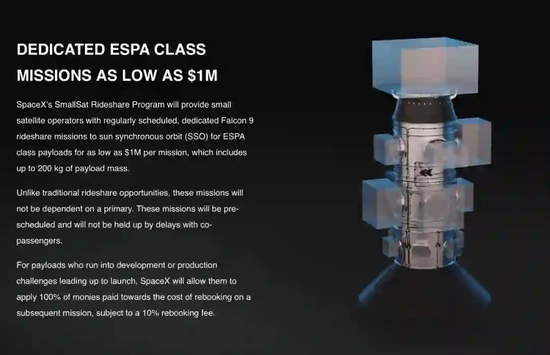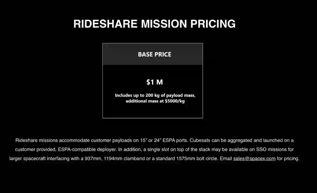 SmallSat rideshare100万美元的基础价格包括200公斤的有效载荷,额外的重量为5000美元/公斤 | SpaceX官网