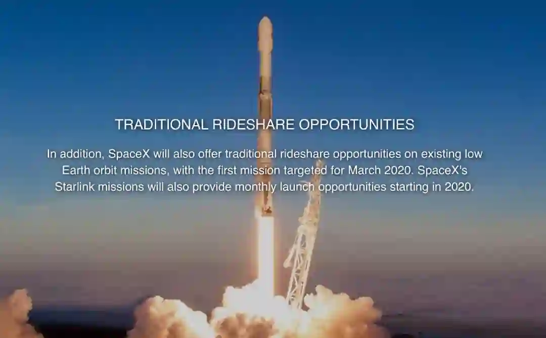 这项名为 SmallSat rideshare 的服务于今年 8 月官宣,并在其官网首页占据了头条广告位置。详情页图文并茂地展示了服务的具体内容和预约方式。SpaceX 表示,公司将在现有的近地轨道发射任务中提供太空拼车的机会,也就是帮助卫星制造商把小卫星顺利送上指定轨道。首个任务将在 2020 年 3 月发射。此外,SpaceX「星链」任务也将从 2020 年开始,每月提供一次发射机会。