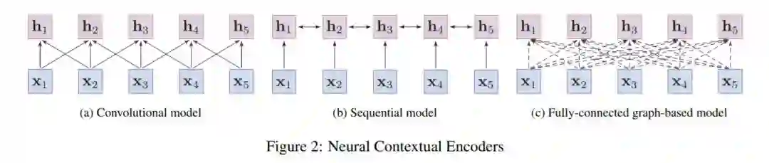 大部分的神经上下文编码器可以分为三类:卷积模型、序列模型和基于图的模型。图2说明了这些模型的体系结构。