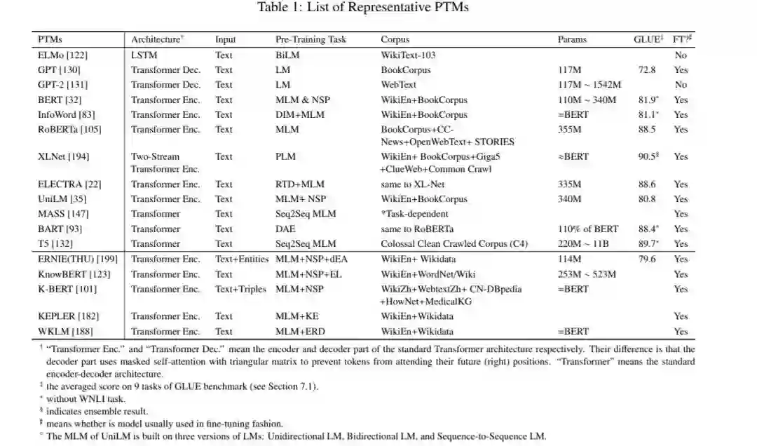 最近大量的工作表明,在大型语料库上的预训练模型(PTMs)可以学习通用语言表示,这对后续的NLP任务是有益的,可以避免从零开始训练新模型。随着计算能力的发展,深层模型(即随着训练技能的不断提高,PTMs的体系结构由浅向深推进。第一代PTM的目标是学习好的词嵌入。由于下游任务不再需要这些模型本身,它们在计算效率方面通常非常肤浅,如Skip-Gram[116]和GloVe[120]。虽然这些预训练的嵌入可以捕获单词的语义含义,但它们是上下文无关的,不能捕获文本的高级概念,如语法结构、语义角色、回指等。第二代PTMs主要学习上下文词嵌入,如CoVe[113]、ELMo[122]、OpenAI GPT[130]、BERT[32]等。这些学习过的编码器仍然需要在上下文中通过下游任务来表示单词。此外,还提出了各种预训练的任务,以学习PTMs的不同目的。