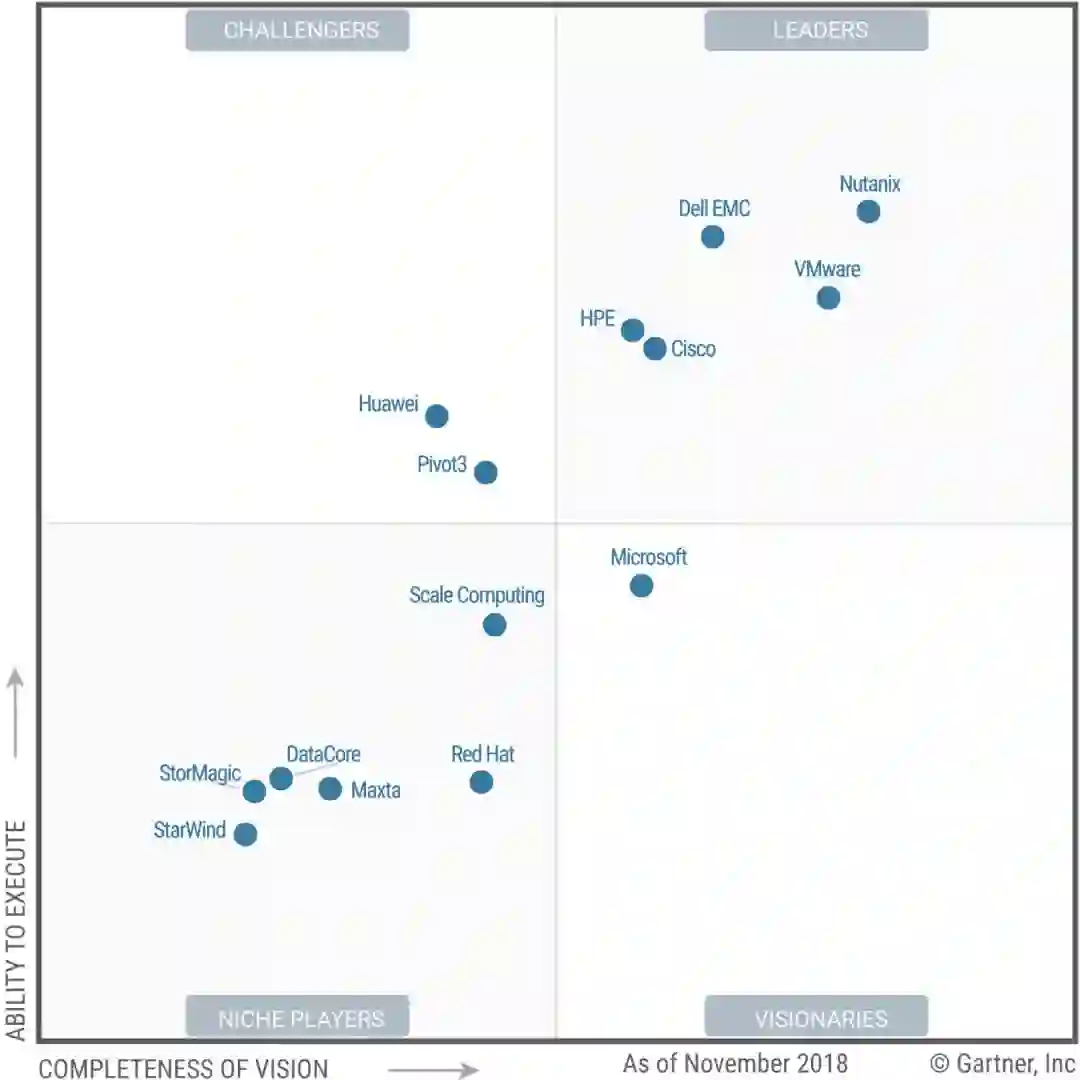 超融合基础架构魔力象限,资料来源:Gartner(2018年11月)