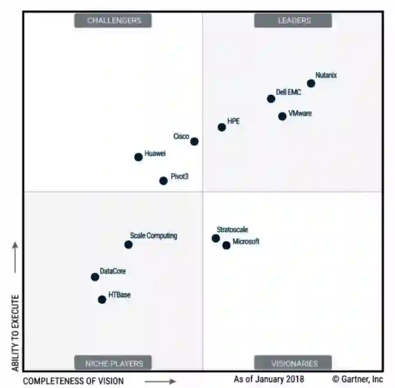 超融合基础架构魔力象限,资料来源:Gartner(2018年1月)