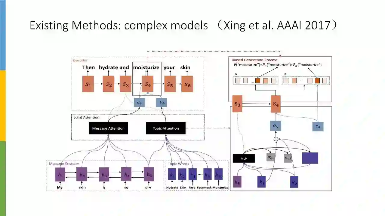 上图中的论文,则是在生成时将概率 bias 到一些特定的主题词。假设某个词是主题词,我们就在生成过程中相应提高它被选中的概率。