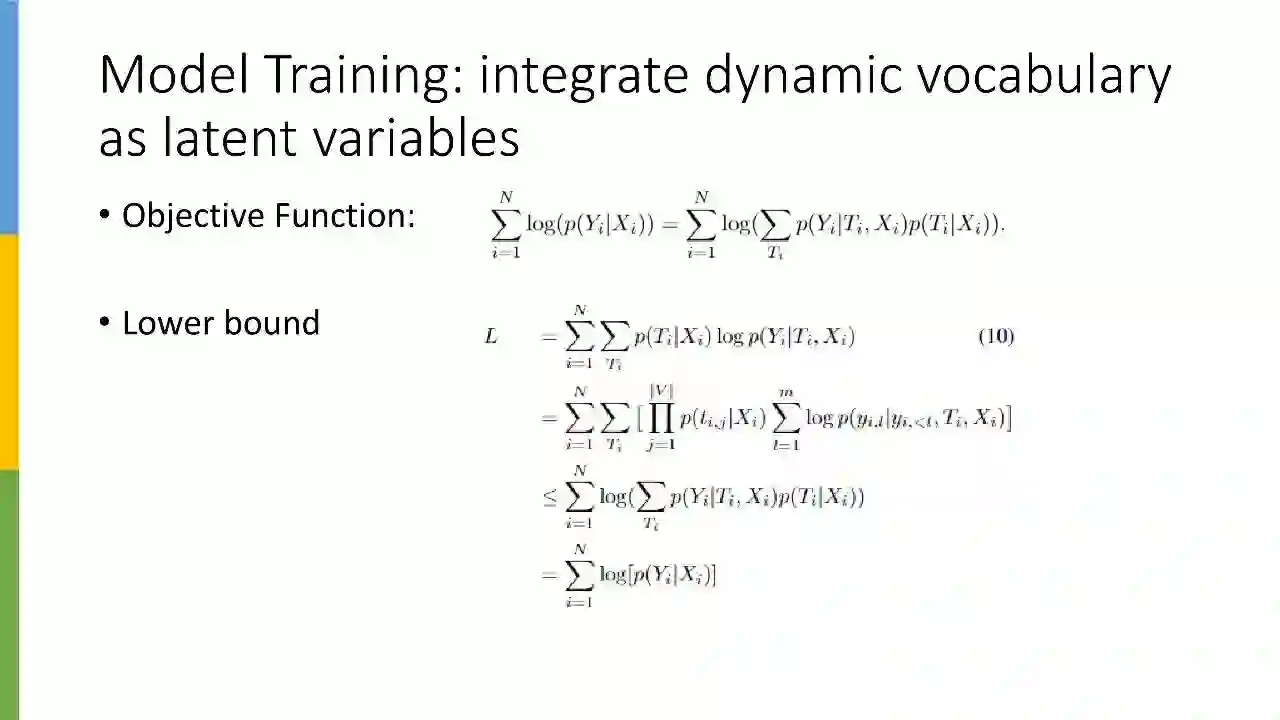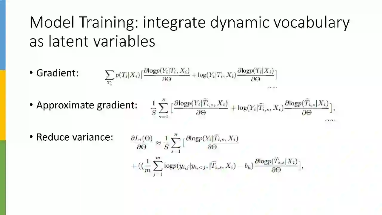 为了解决这个问题,我们在训练时选择将动态词典作为一个隐变量来处理。针对公式的详细推导,大家可以参考论文。