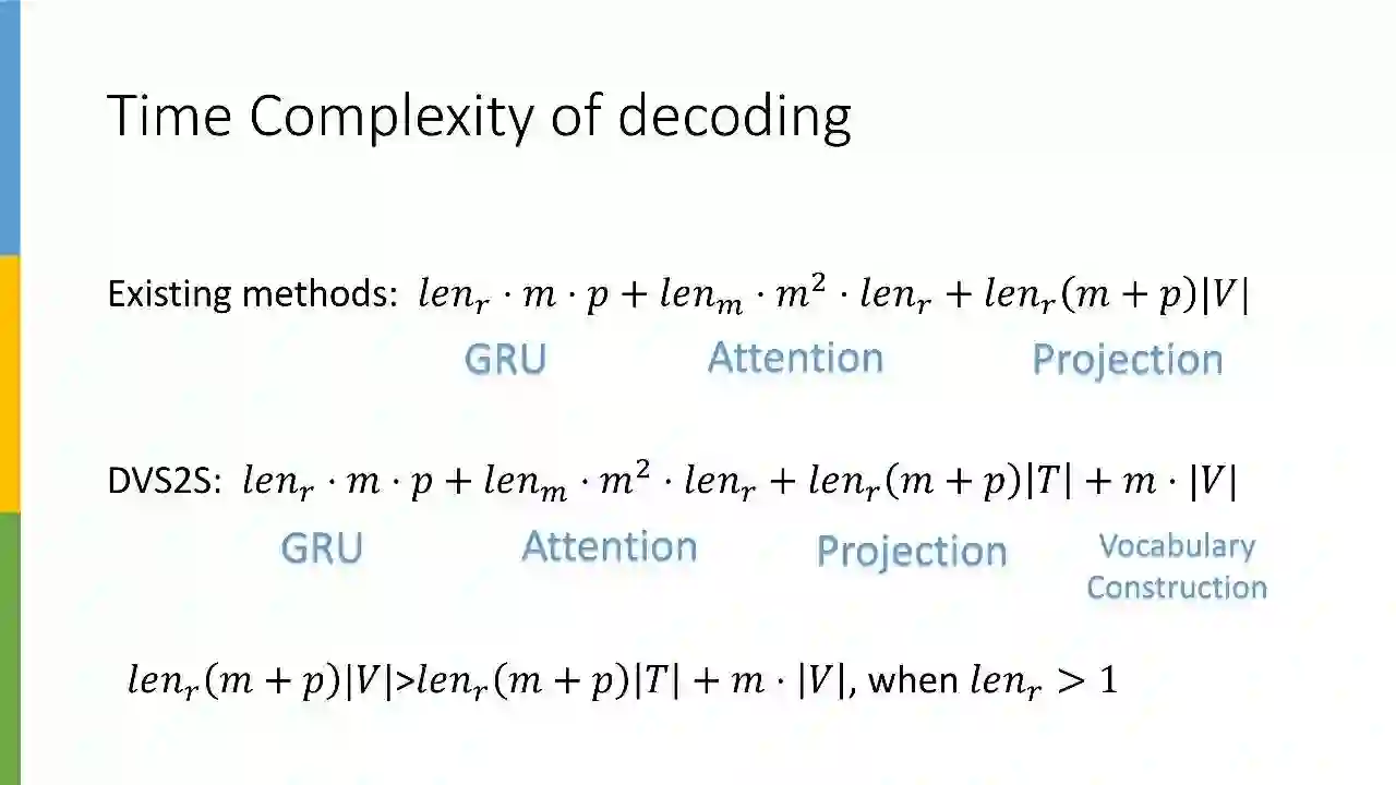 首先将 Seq2Seq 和本文的 decoding 方法进行对比,可以发现二者在 GRU 和 Attention 上花费的时间完全一致,但是本文方法在 Projection 上花的时间会少很多。