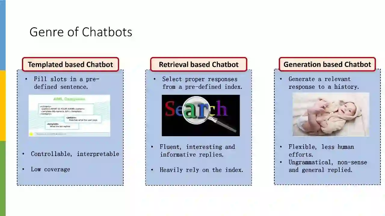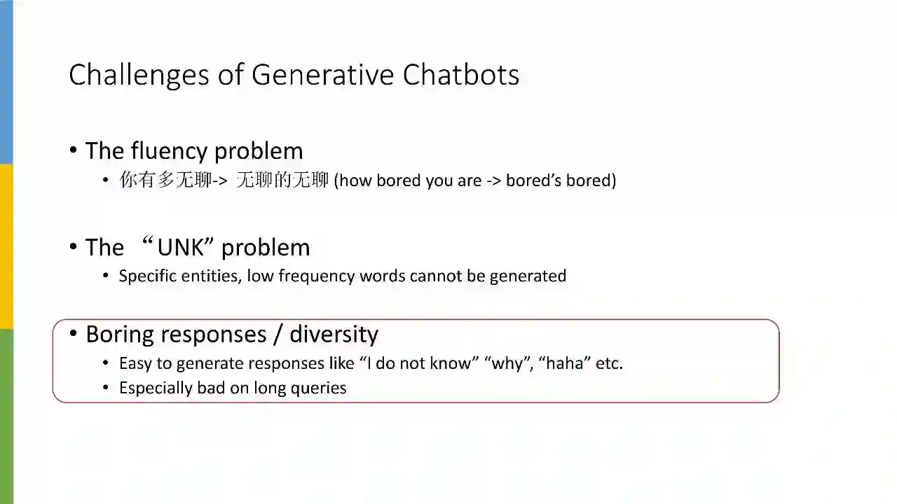 很多人认为 safe responses 是生成式聊天机器人的一个缺点,但其实从某种角度上来说,这也是它的一个优点。相比检索型聊天机器人,它生成的回复质量较为稳定。