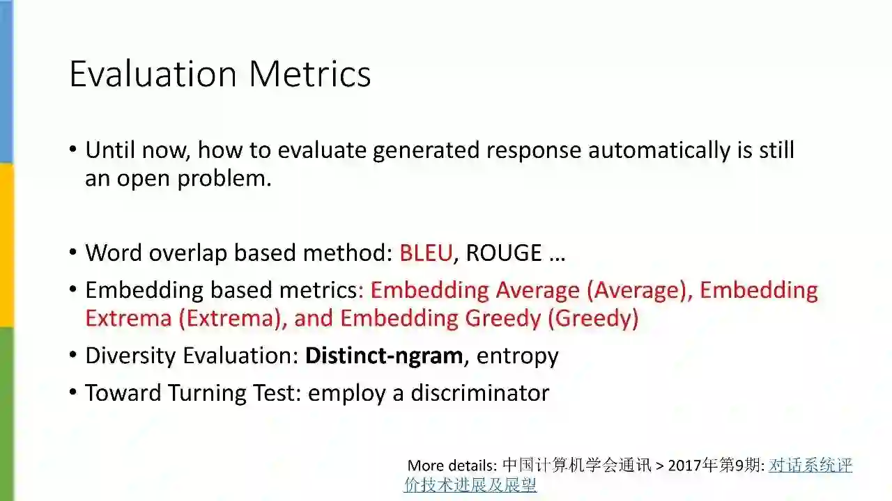 第一类方法是计算 BLEU 值,也就是直接计算 word overlap、ground truth 和你生成的回复。由于一句话可能存在多种回复,因此从某些方面来看,BLEU 可能不太适用于对话评测。