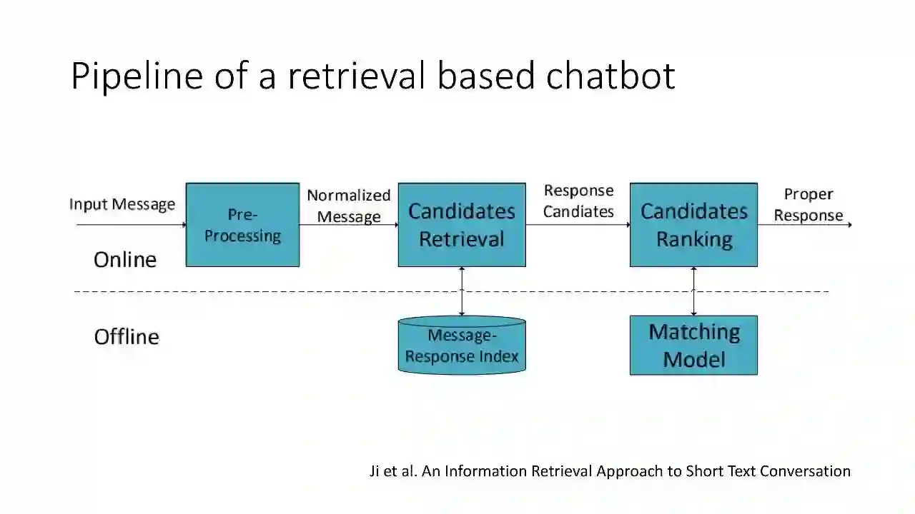 另外,对于研究人员来说,检索型聊天机器人比较易于评测,借助 MAP、MRR、NDCG 等传统信息检索方法即可完成。