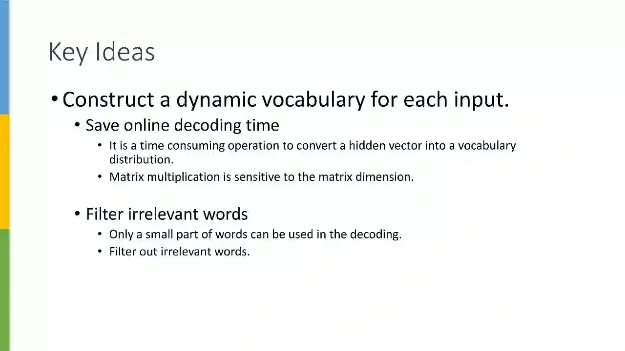 详细来说,我们会给每一个 input 构建一个动态词典。这么做的目的是为了减少在线 decoding 时间,同时对不相关词进行剔除。