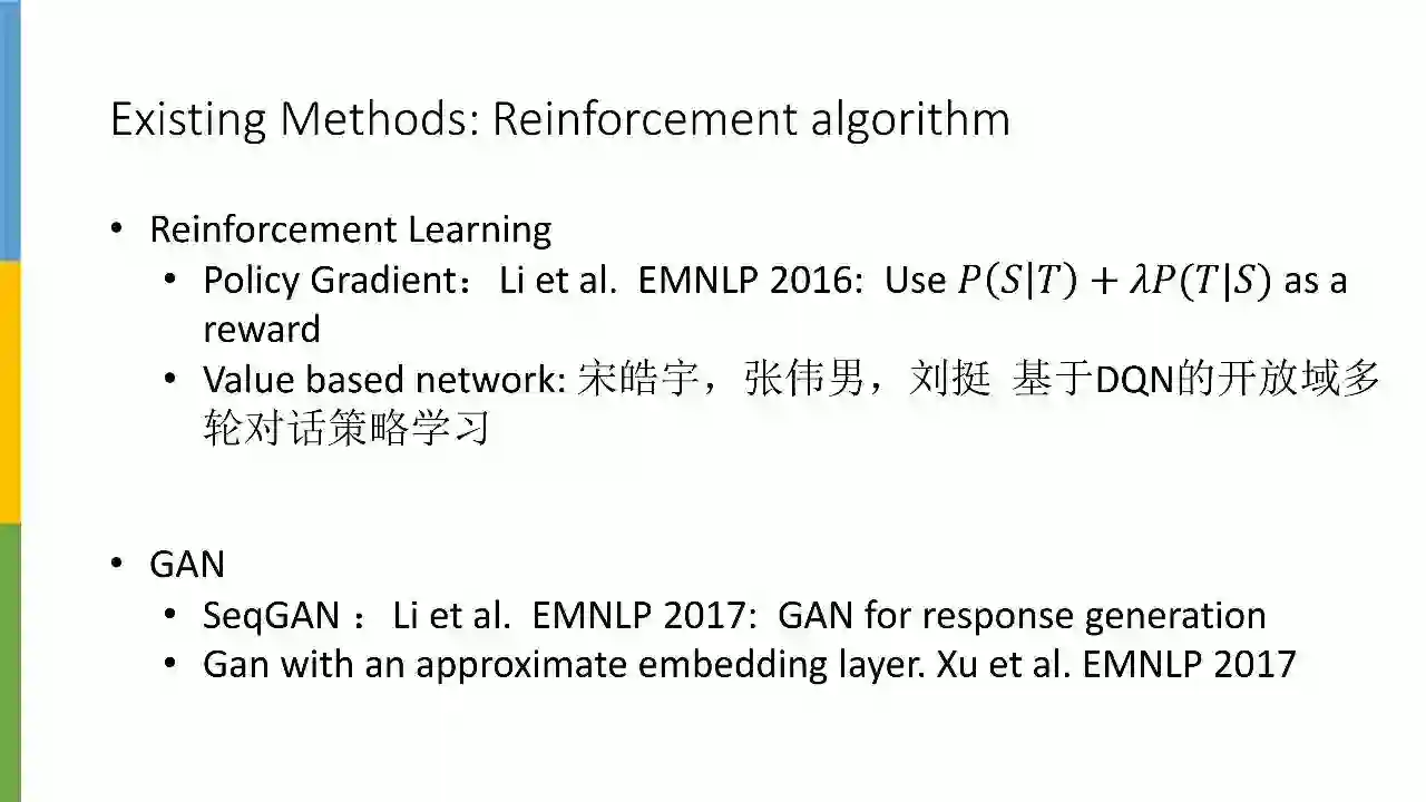 基于策略的代表作来自李纪为,其基本思路是:假设已有生成模型 G,给定一个 input 并生成 20 个回复,利用排序公式 P(S|T) + λP(T|S) 对回复进行评分作为 reward。Reward 值越大,梯度更新则相应越大。