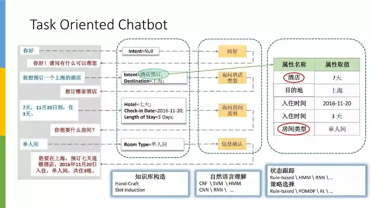 面向任务的对话系统主要分为知识库构造、自然语言理解、状态跟踪和策略选择。针对知识库构造,假设我们的使用场景为酒店预订,那首先我们需要构建一些和酒店相关的知识,比如酒店房型、报价以及酒店位置。