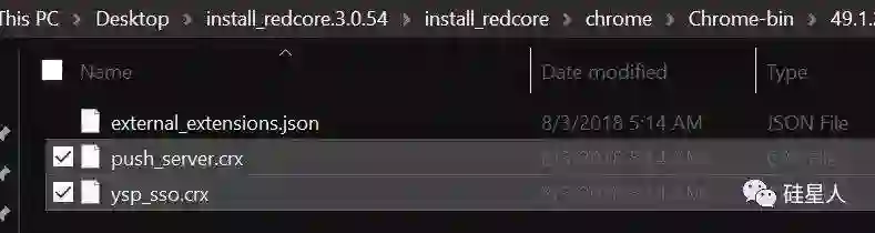 更诡异的是,下图可以看到,这个安装包里自带了两个兼容 Chrome 的插件(.crx 是 Chrome 插件的扩展格式):