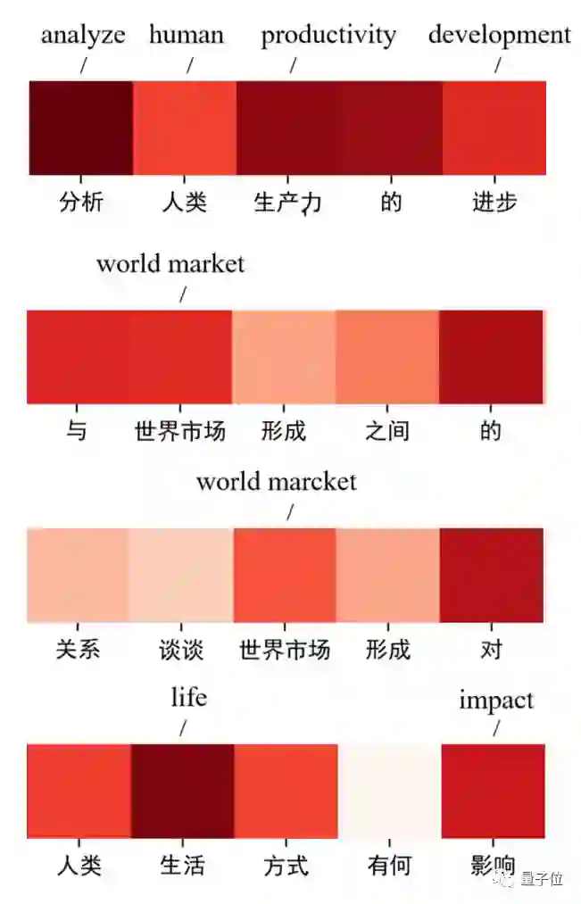 标点符号都被去掉了,而所有的词汇都被拆分成了一个一个的标签用不同深度的红色表示。