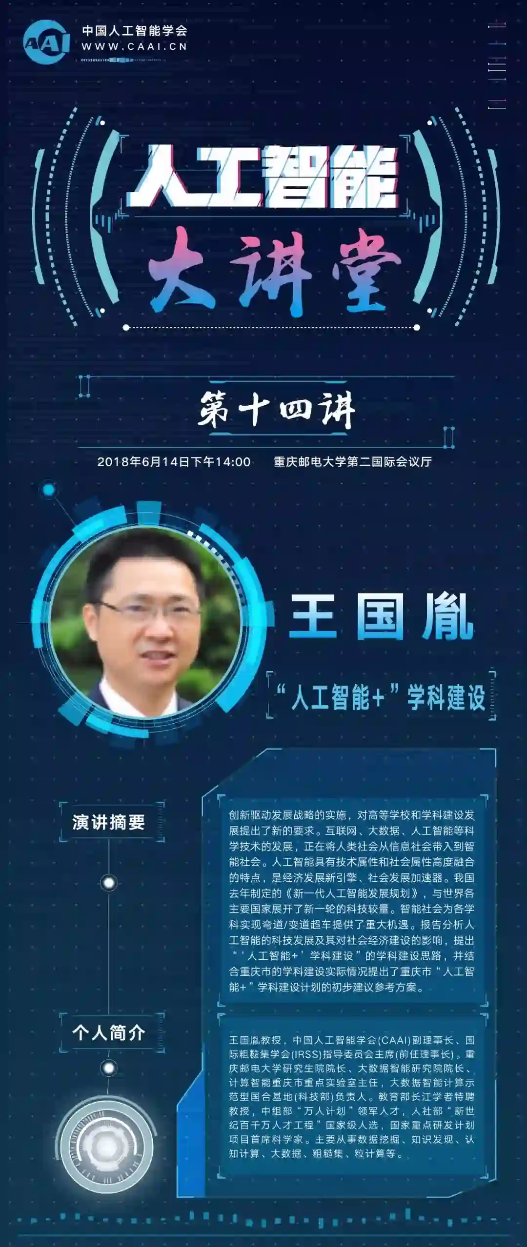2018年6月14日,中国人工智能学会(CAAI)副理事长王国胤教授将在重庆邮电大学为大家带来精彩的第十四讲。