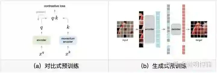 最后谈谈预训练,在ViT原始论文中使用了大规模JFT数据集,supervised预训练为图片分类带来了极大的提升,同时也证明了ViT是data-hungry的模型。然而,预训练的本质是视觉表征学习,这亦可以通过self-supervised的方式进行预训练学习,主要可以根据pretext task的类型分为两种方法:对比式预训练和生成式预训练:对比式预训练代表主要有SimCLR和MoCo等,它们都是衡量相似度以提炼视觉特征;而生成式预训练多数是效仿Bert或GPT,以Mask的机制重建或生成原始图像,典型的代表有iGPT和BEiT等,其实早在ViT论文中也做过类似的预训练,但没有很work。直到最近何凯明大神的MAE出现,打开了Mask生成式预训练的大门,通过一个简单模型在小数据量下达到超越监督式的效果。